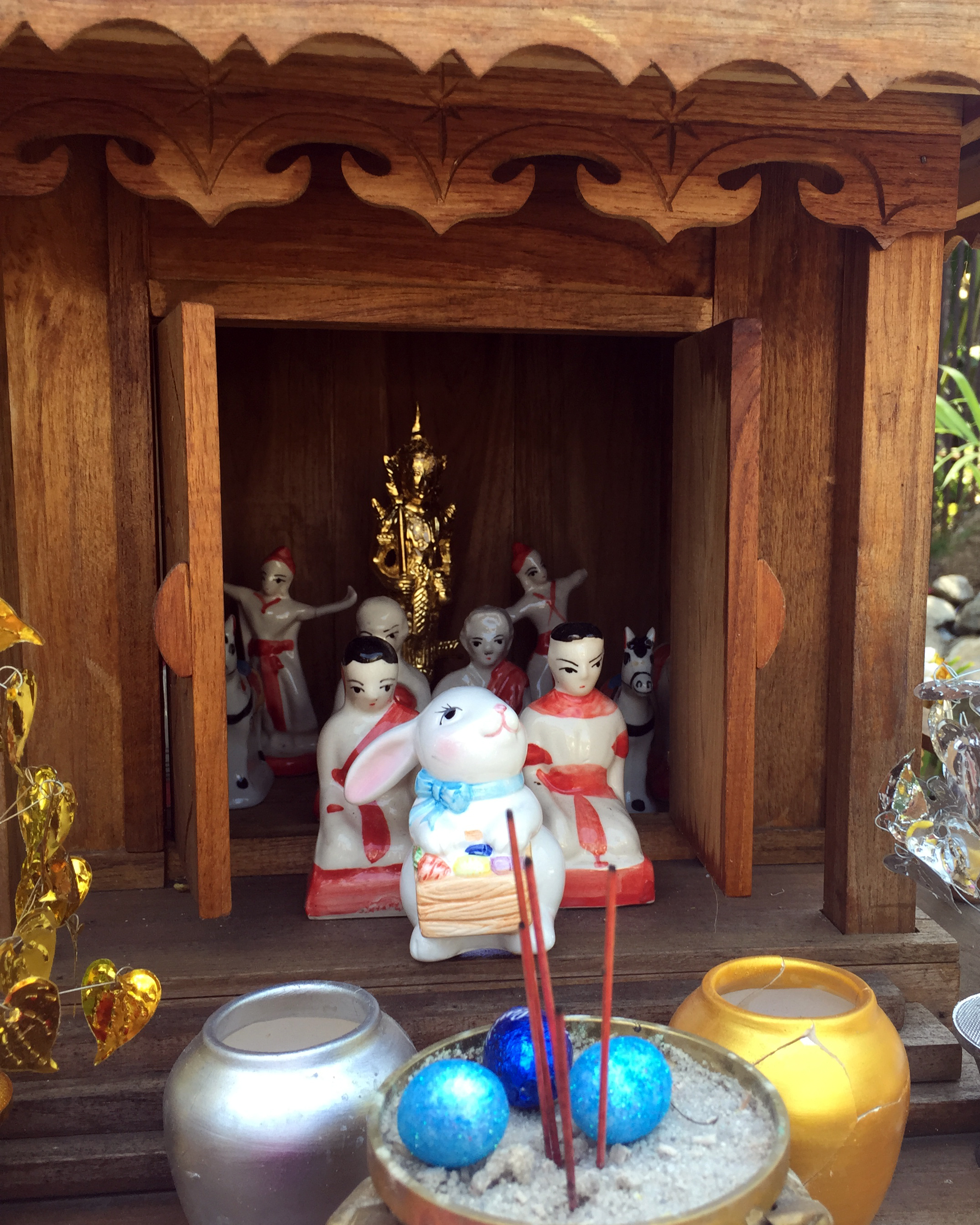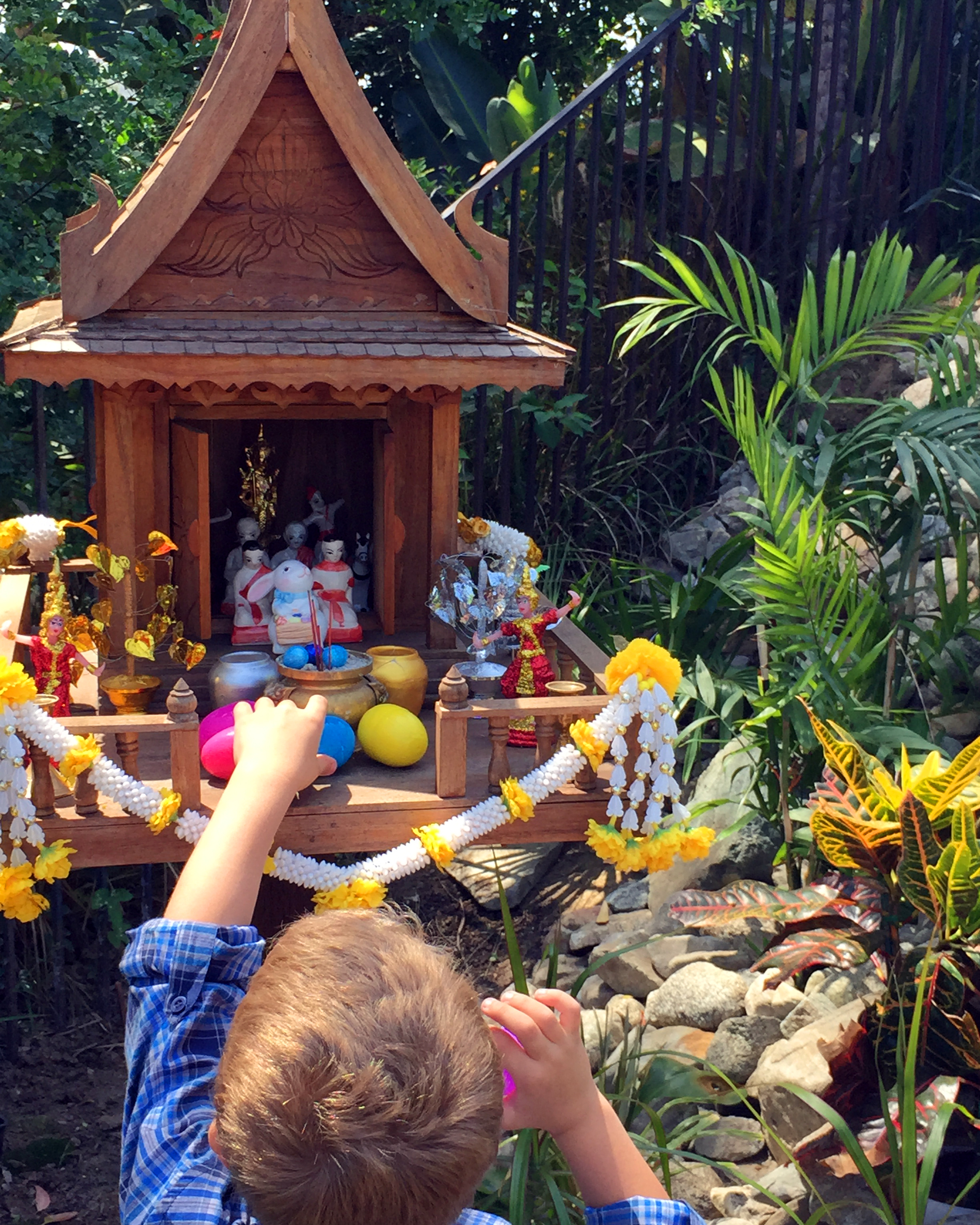 These sweet California boys (my relatives) are placing Easter eggs on their family spirit house. I offered a little ceramic bunny rabbit to the land guardians for their amusement. Happy Easter!